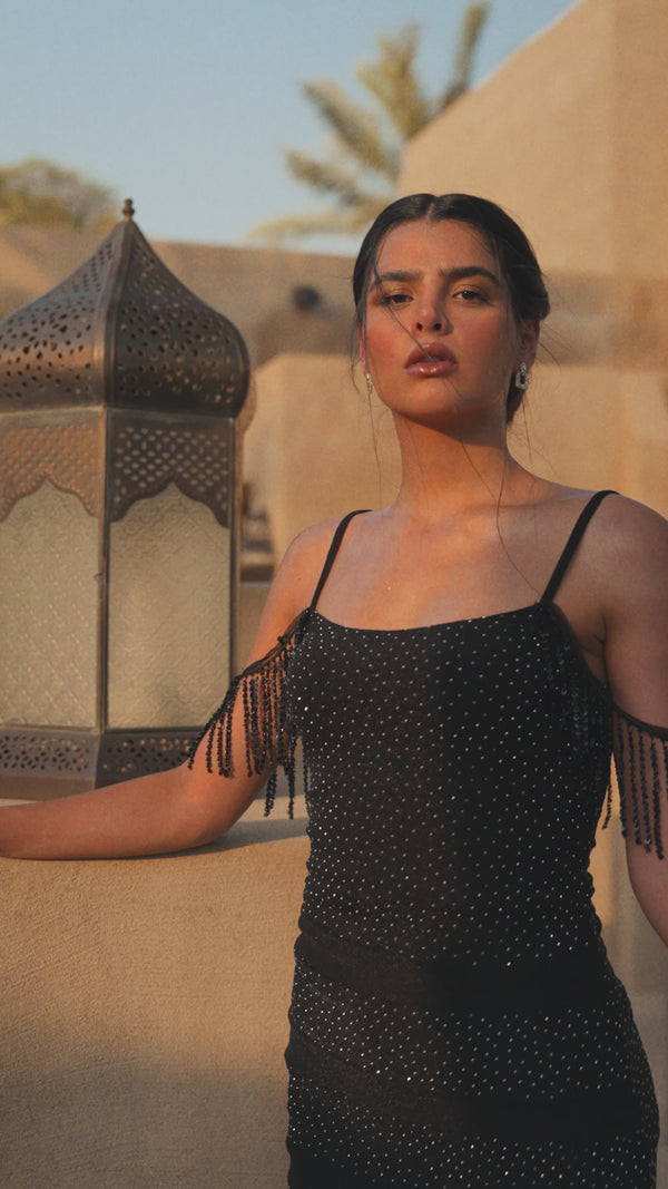The Noir dress is made to turn heads. Featuring a low-cut neckline and a short, fitted bodycon shape, it is covered in black sequins and subtle embellishments that sparkle with every move. The playful fringe adds texture and rhythm, bringing life and motion to your every step. Designed for nights that demand bold confidence and glamour.