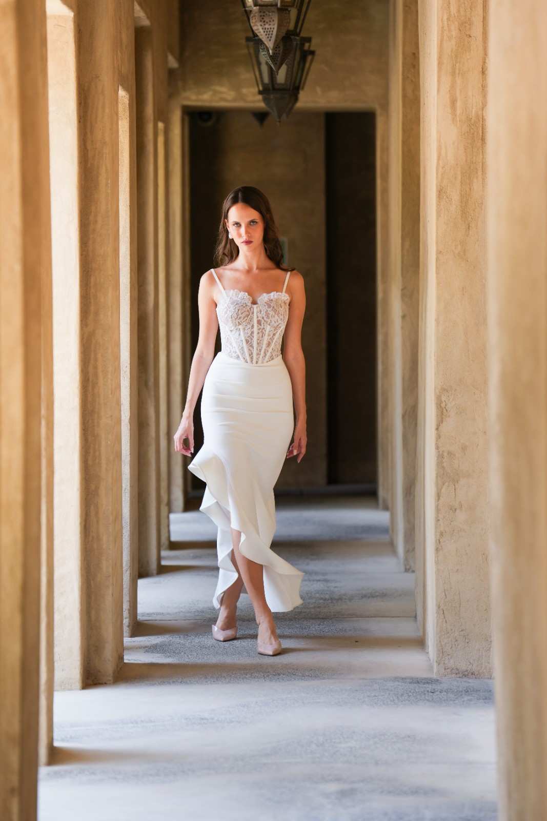 The Reina dress is a symbol of purity and poise. Crafted from fine spandex knit fabric for a comfortable fit, it features delicate lace accents that highlight its feminine shape. The asymmetrical hem and fine straps add a modern twist, while the soft white tone keeps it effortlessly elegant. Ideal for parties, celebrations, or intimate gatherings where simplicity shines.