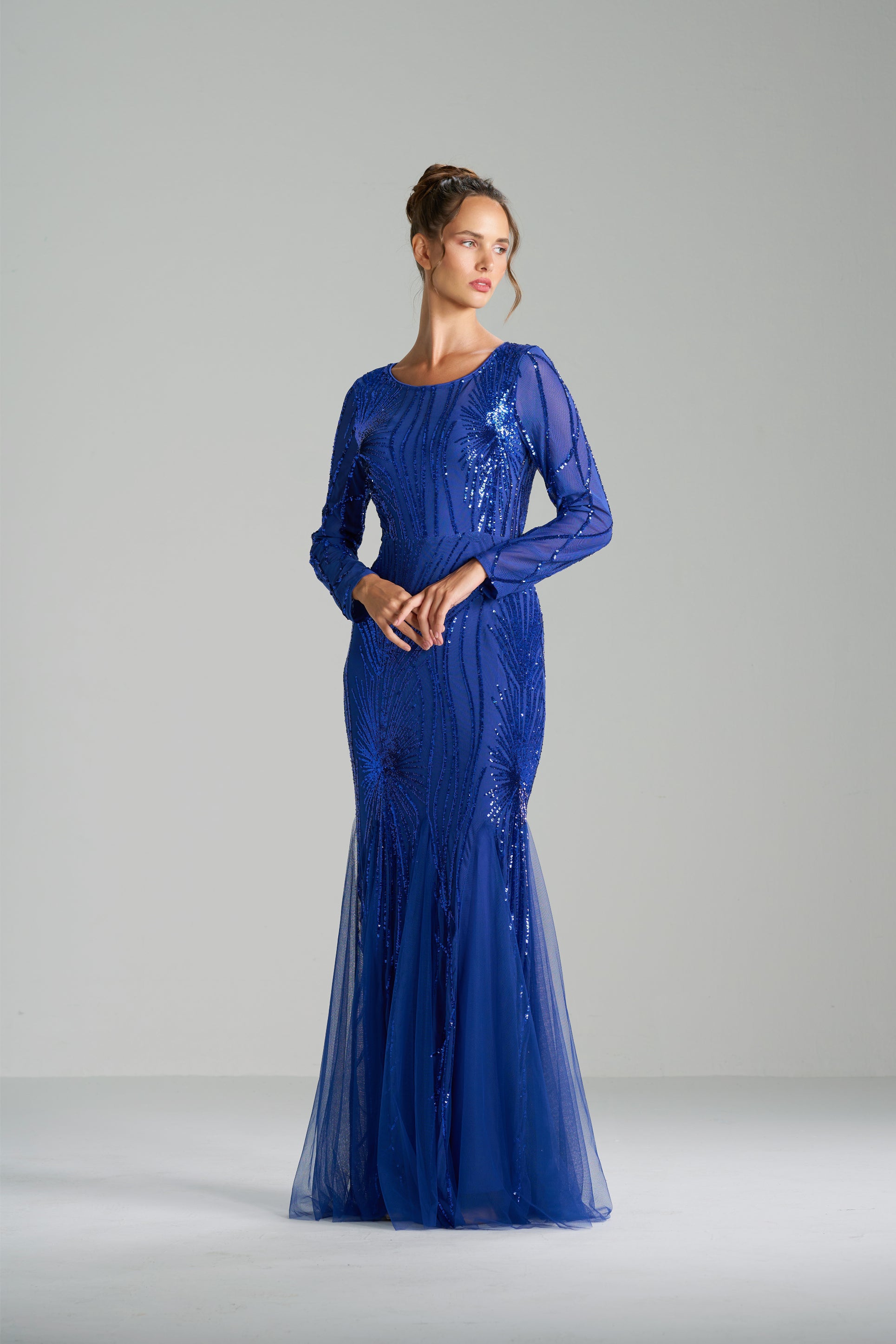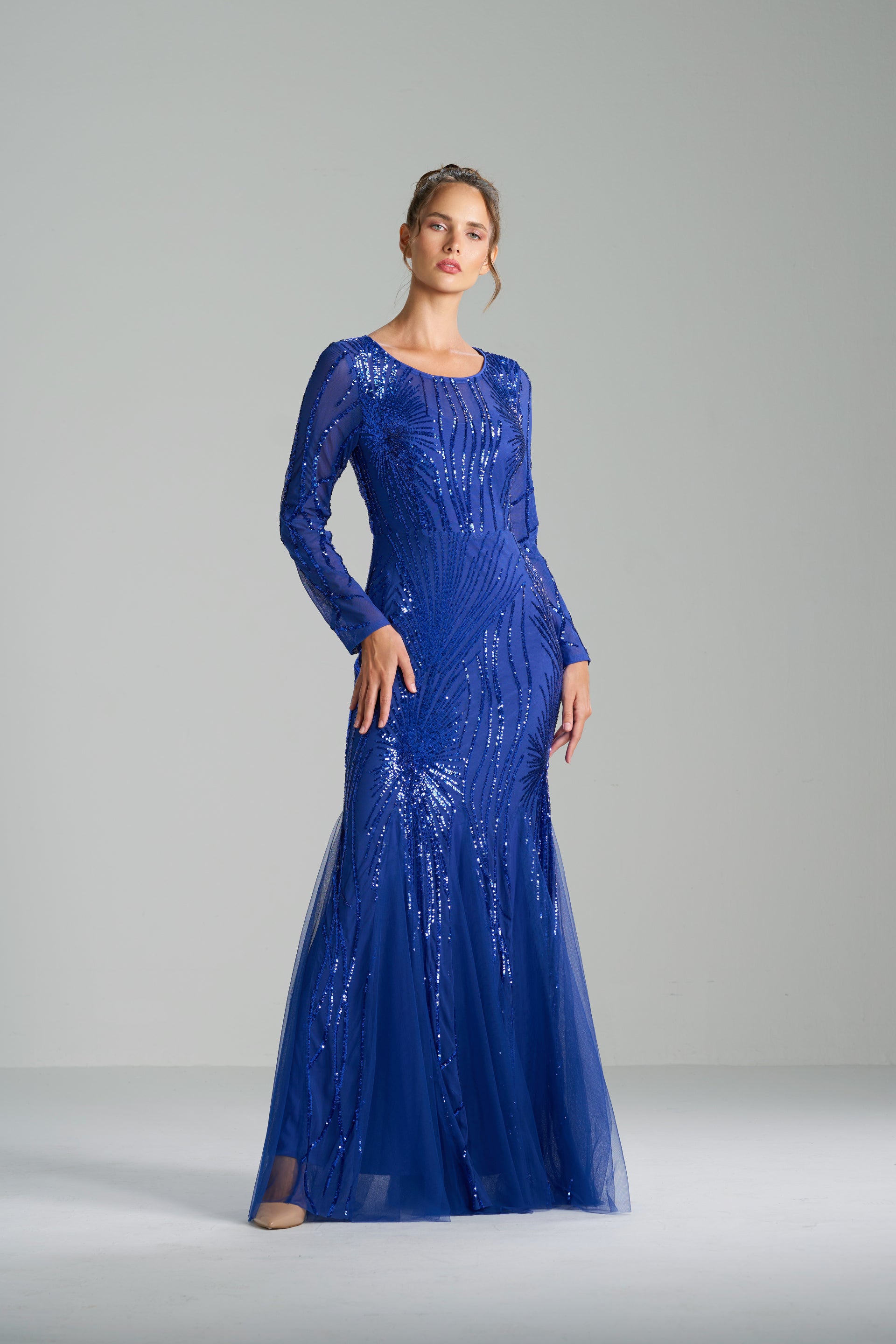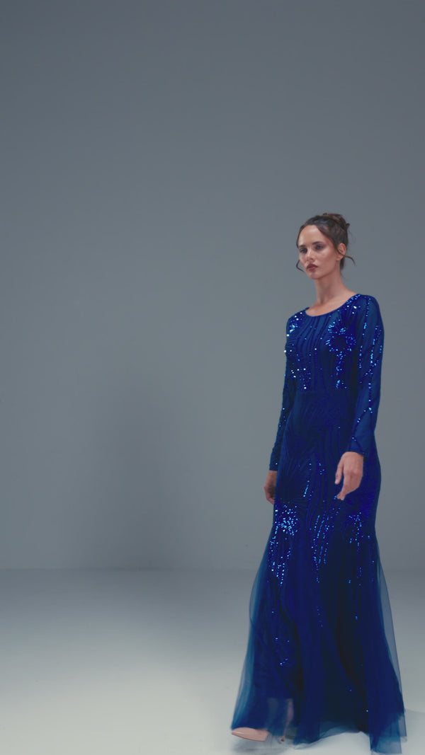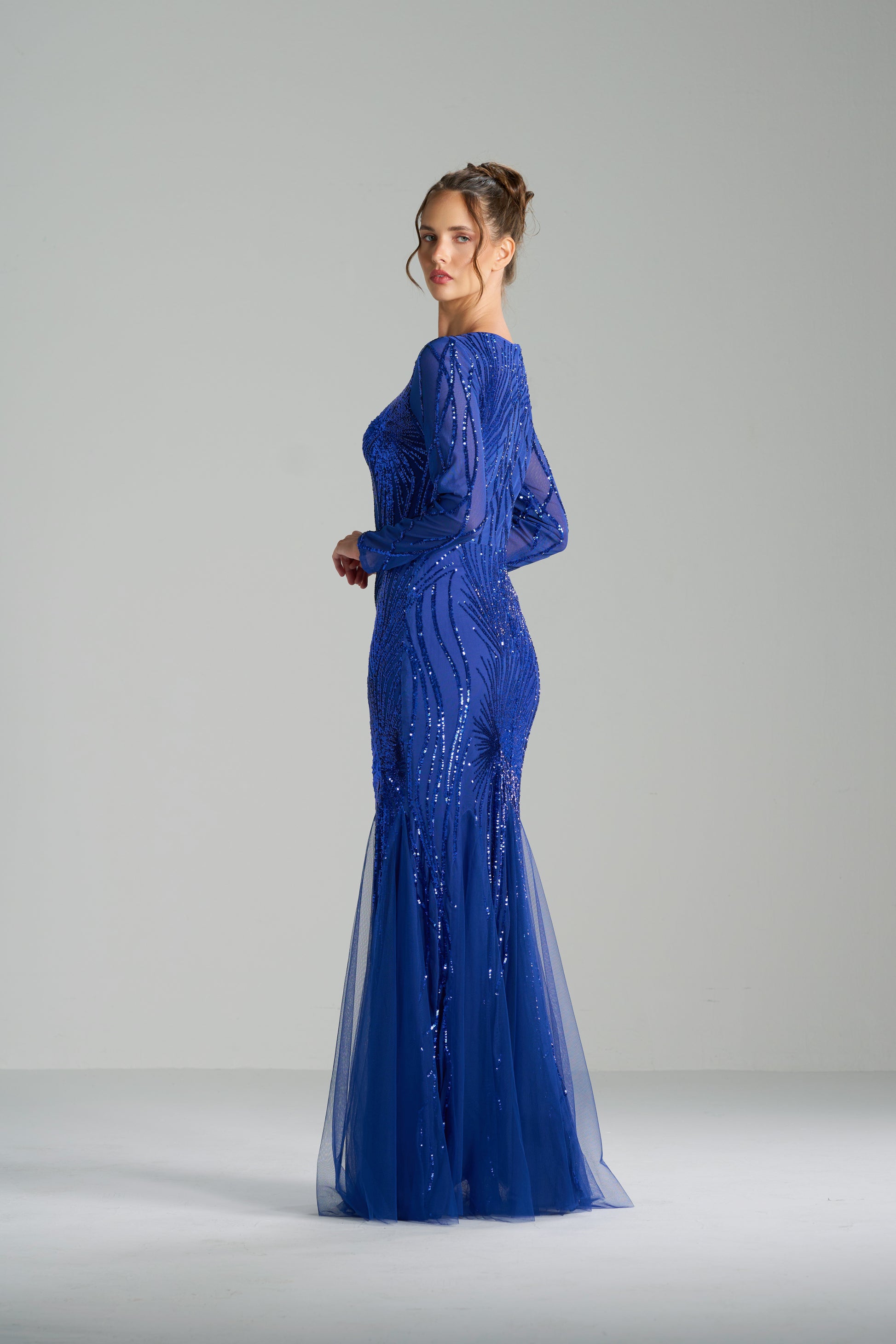 The TATIANA gown is a dazzling piece that combines bold color with intricate detailing. Featuring a vibrant royal blue hue and sparkling sequin embellishments, this gown creates a mesmerizing effect that captures the light from every angle. The flowing tulle bottom adds movement and elegance, while the long sleeves enhance the sophisticated silhouette. Perfect for glamorous occasions, the TATIANA gown will make you shine with confidence and beauty.